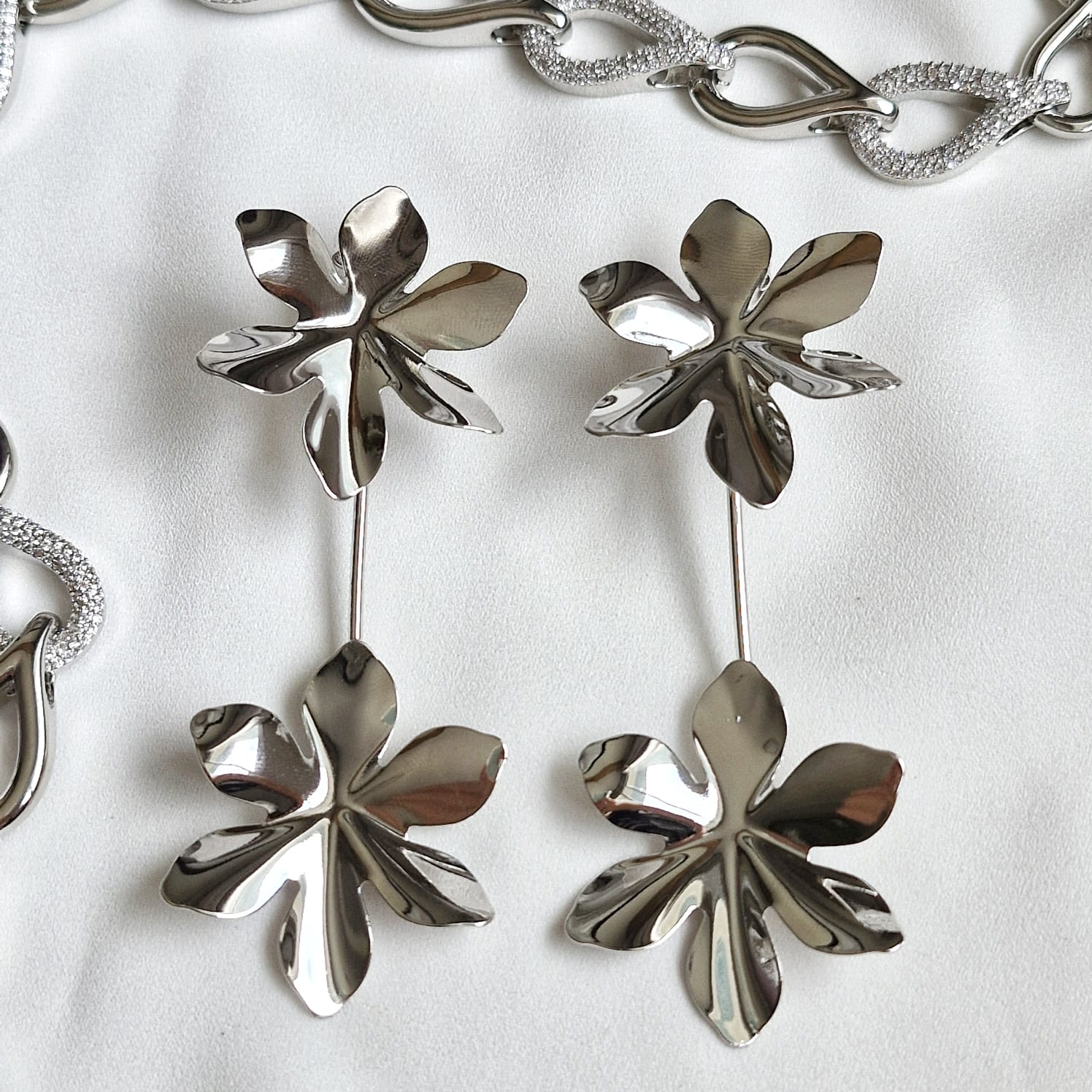 Com design floral sofisticado e acabamento impecável no banho prateado antialérgico, ele oferece conforto mesmo em longos períodos de uso. O grande destaque está na tarraxa especial com pingente em formato de flor, criando um efeito de movimento leve e elegante.