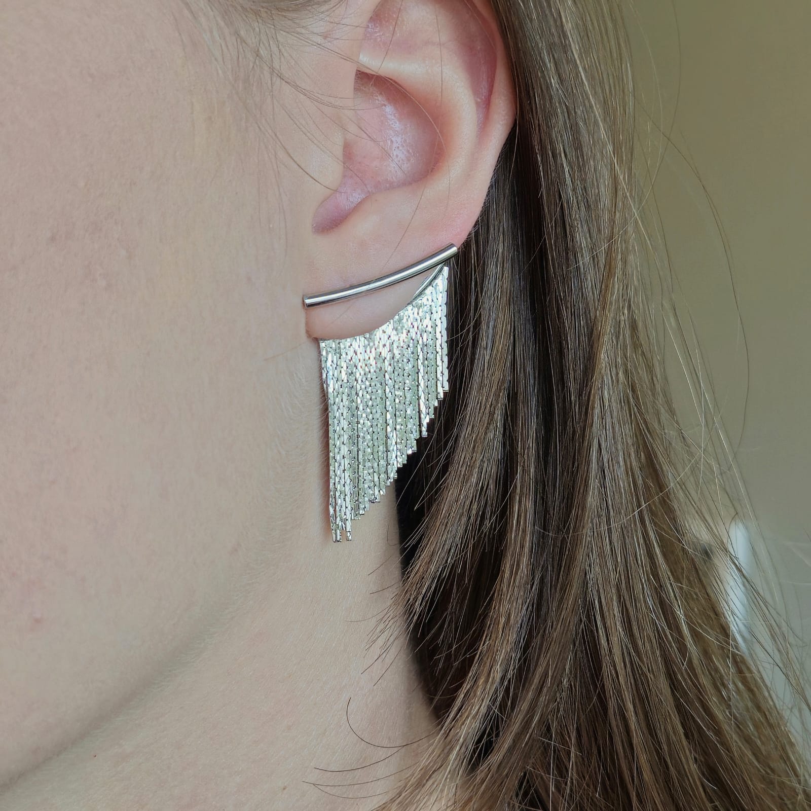 Movimento, brilho e sofisticação em uma única peça. O Brinco Frange D’Argent Prateado traz um design inovador onde a própria tarraxa se transforma na franja, criando um efeito moderno e surpreendente. Suas correntes prateadas caem com leveza, refletindo a luz a cada movimento e adicionando um toque de glamour atemporal.