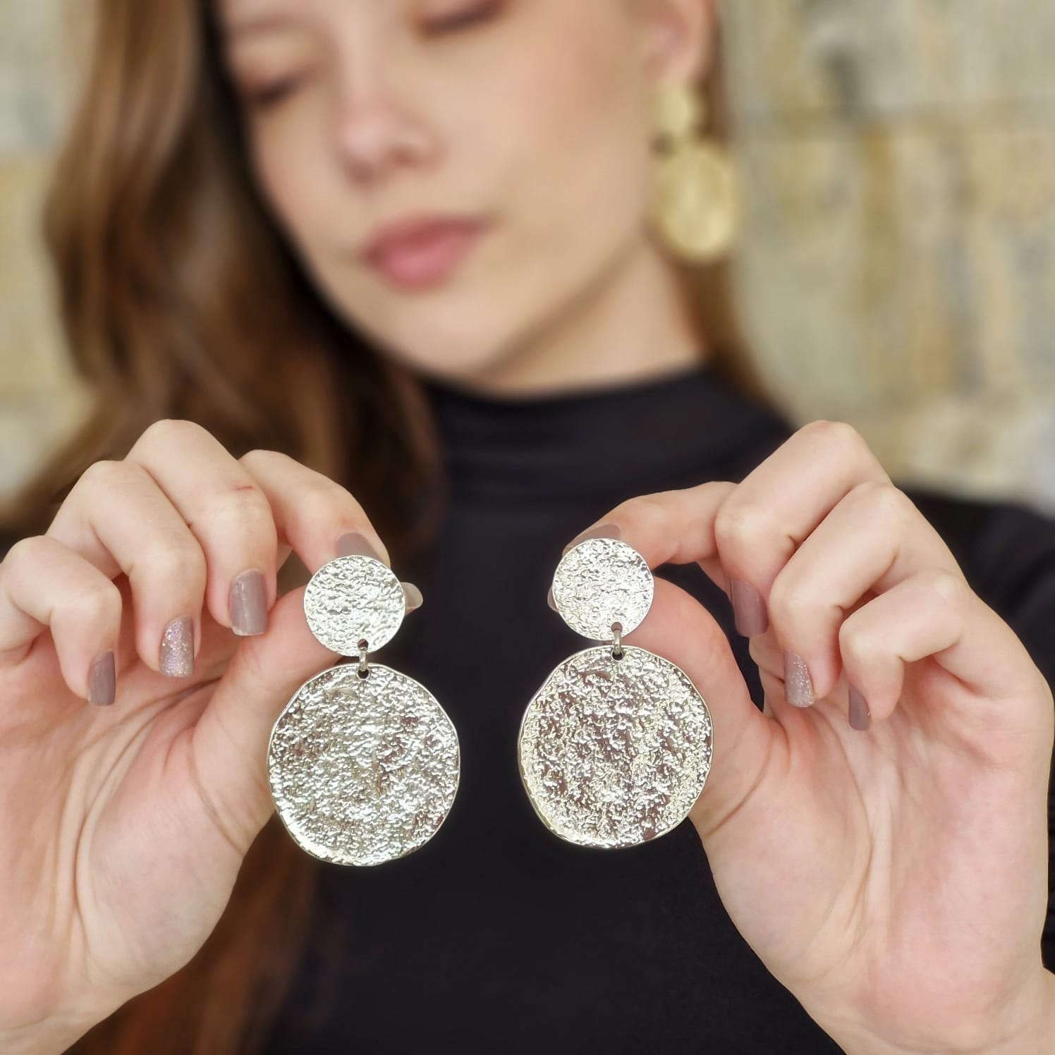 O Brinco Sfera prateado é uma verdadeira escultura em movimento. Composto por esferas metálicas texturizadas em composição vertical alongada, ele traduz força e modernidade em um design ousado e marcante.