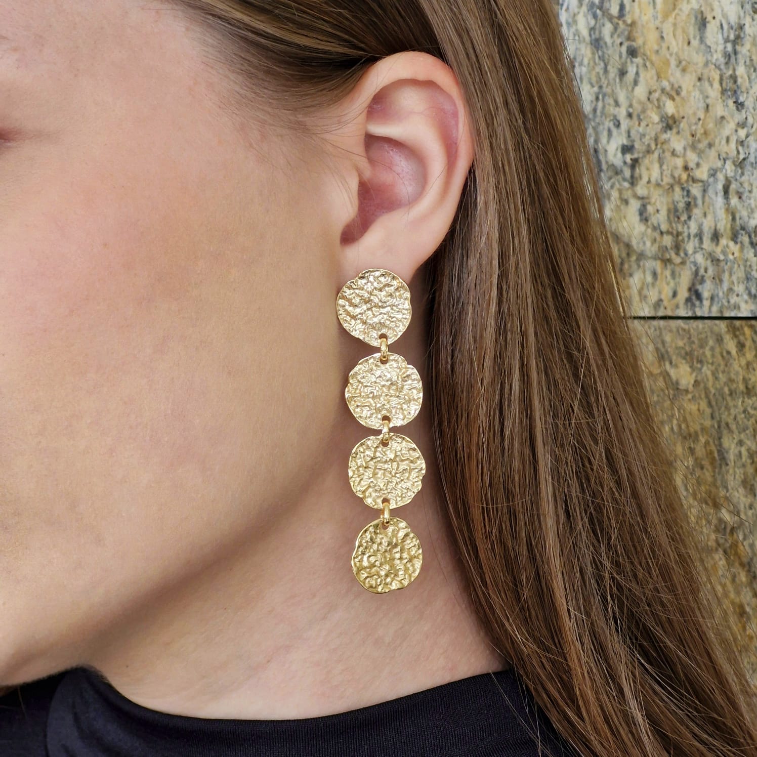 Um verdadeiro statement de estilo. O Brinco Solaré dourado é composto por quatro esferas marteladas, articuladas entre si, criando movimento leve e um efeito visual impactante. Seu banho dourado intenso aliado à textura orgânica faz dessa peça uma escolha perfeita para quem ama sofisticação com atitude. Versátil e atemporal, ele pode ser o protagonista de looks clássicos ou arrematar produções mais ousadas.