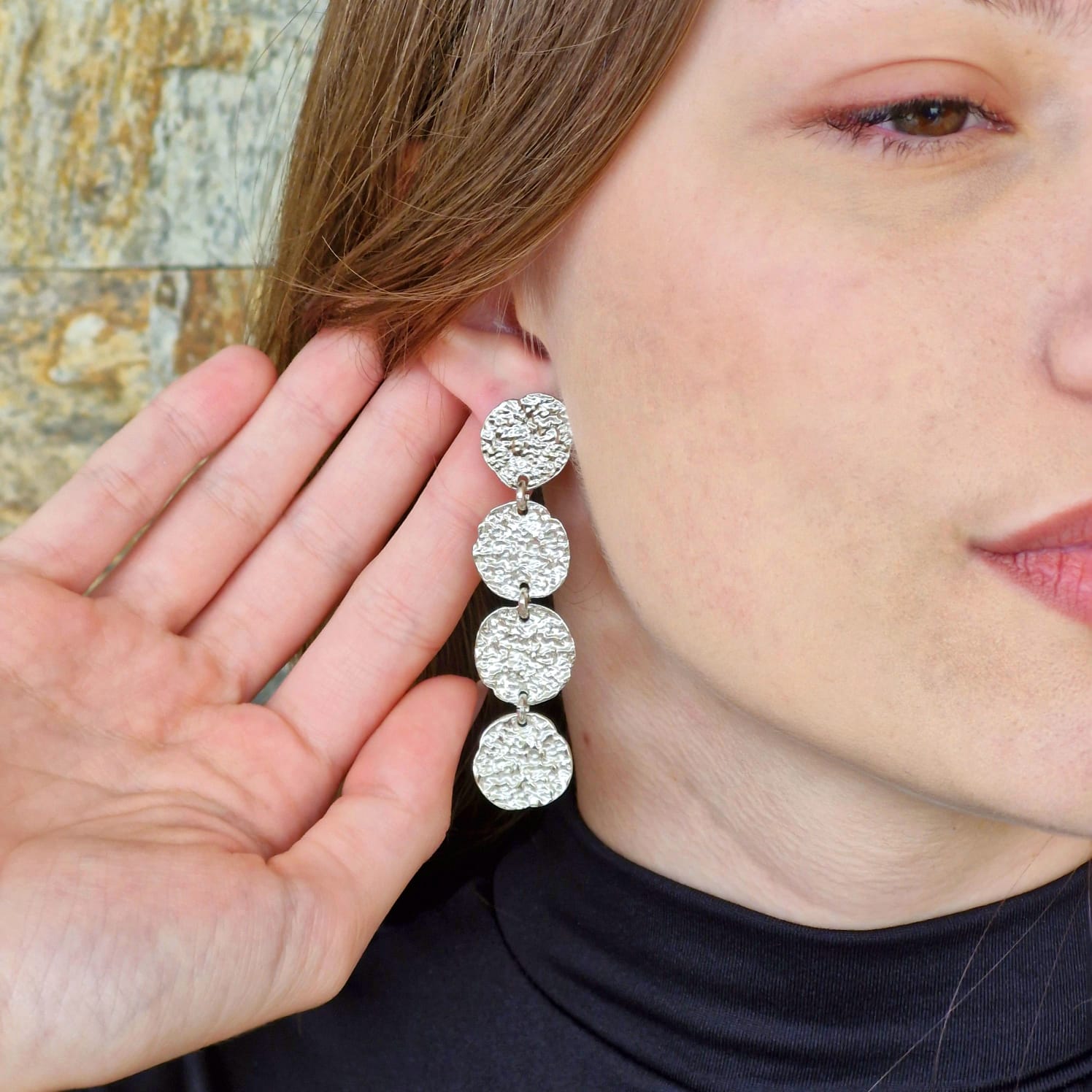 Um verdadeiro statement de estilo. O Brinco Solaré Prateado é composto por quatro esferas marteladas, articuladas entre si, criando movimento leve e um efeito visual impactante. Seu banho prata intenso aliado à textura orgânica faz dessa peça uma escolha perfeita para quem ama sofisticação com atitude. Versátil e atemporal, ele pode ser o protagonista de looks clássicos ou arrematar produções mais ousadas.