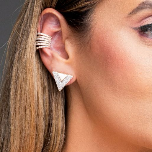 O brinco tríade possui formato triangular e cravação em zircônias.
