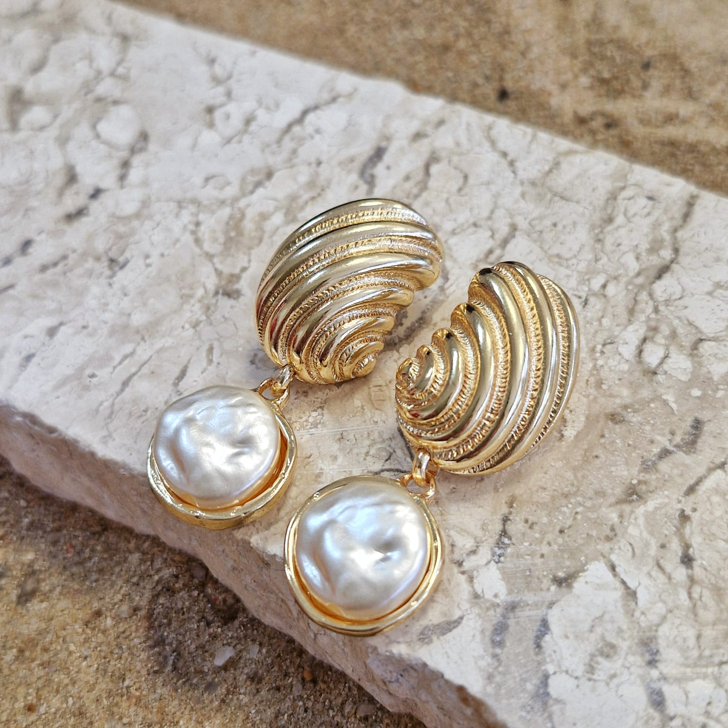 Os Brincos Conchas Douradas com Madrepérola Aurora são uma peça que combina design escultural e tendência summer 2026. A concha dourada, com acabamento texturizado e curvas orgânicas, valoriza o rosto, enquanto a madrepérola natural adiciona brilho suave e singularidade a cada par.