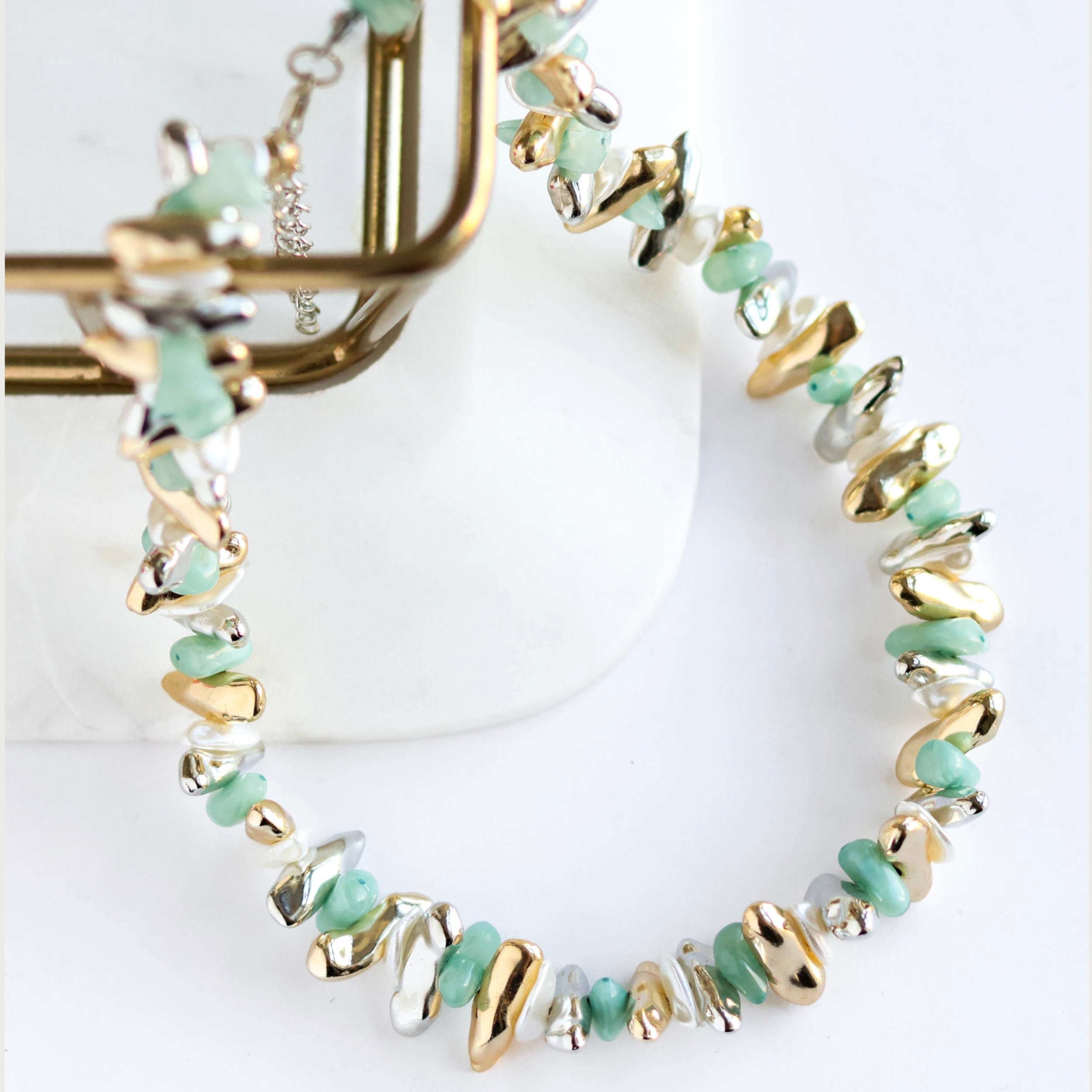Inspirado nas formas orgânicas e no brilho natural do mar, o Colar Maré Serena combina o frescor das pedras em tom verde-água com o luxo sutil do mix de banhos dourado e prateado. Cada detalhe reflete a luz de maneira única, criando um visual leve e sofisticado — perfeito para quem ama acessórios que equilibram elegância e naturalidade. Uma peça que carrega o espírito da coleção Beleza Marinha, traduzindo o encanto das águas em forma de joia.