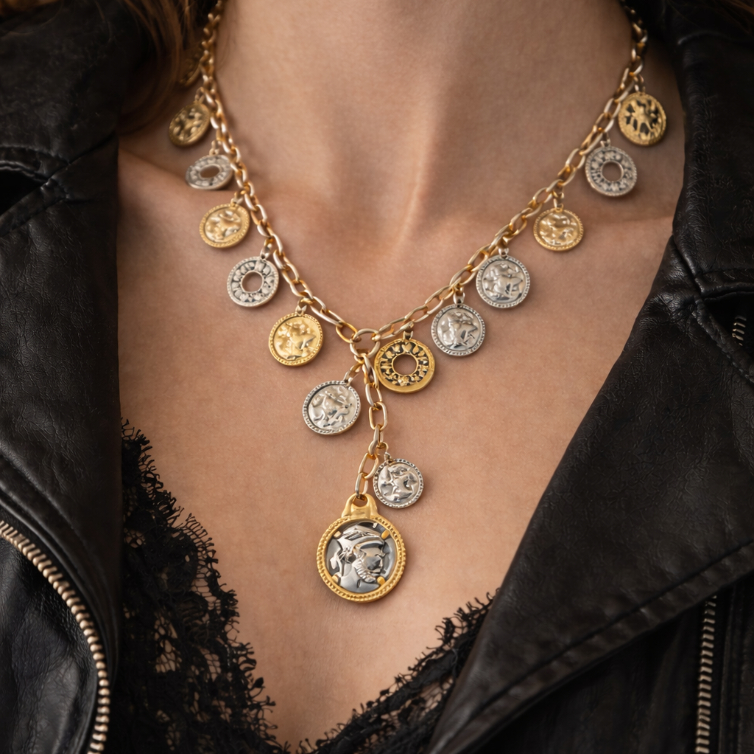 O Colar Moedas Império traduz força, história e sofisticação em um design marcante. Composto por uma corrente robusta e adornado por moedas e elementos orgânicos em prata e dourado, a peça cria um contraste elegante que valoriza o colo com presença e personalidade. Cada detalhe remete à estética clássica reinterpretada sob um olhar contemporâneo, resultando em um colar impactante, mas equilibrado.