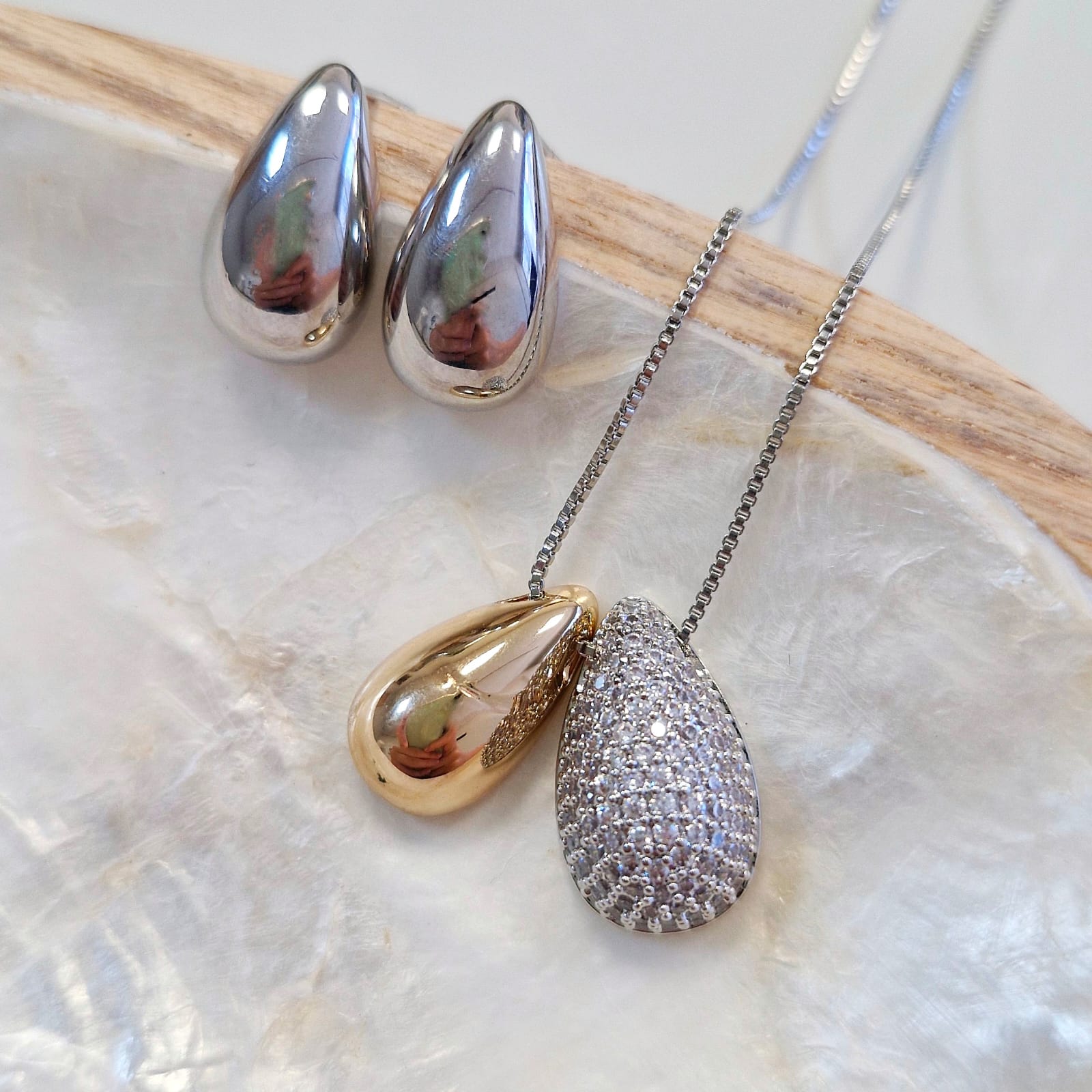 O conjunto Dual traduz a elegância do contraste entre o dourado e o prateado em um design contemporâneo e sofisticado. As formas orgânicas em gota criam um visual moderno, enquanto o brilho polido e o detalhe cravejado trazem luz e refinamento na medida certa.