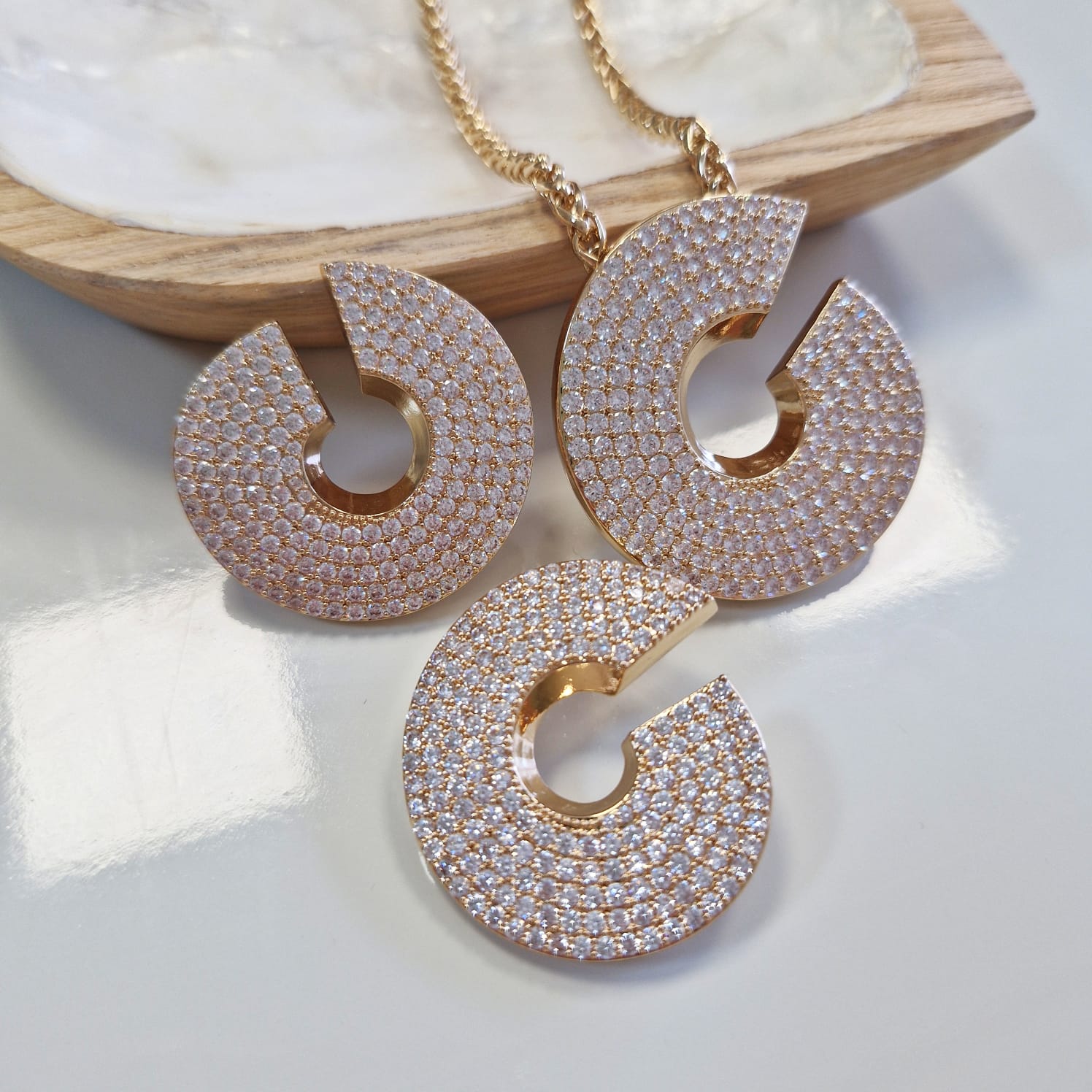 O conjunto Maxi Cravejado é presença. O design maxi, aliado à corrente mais robusta e às zircônias cravejadas, cria um visual impactante, sofisticado e absolutamente luminoso. Cada detalhe foi pensado para refletir a luz com intensidade, transformando o colar e os brincos em protagonistas do look.