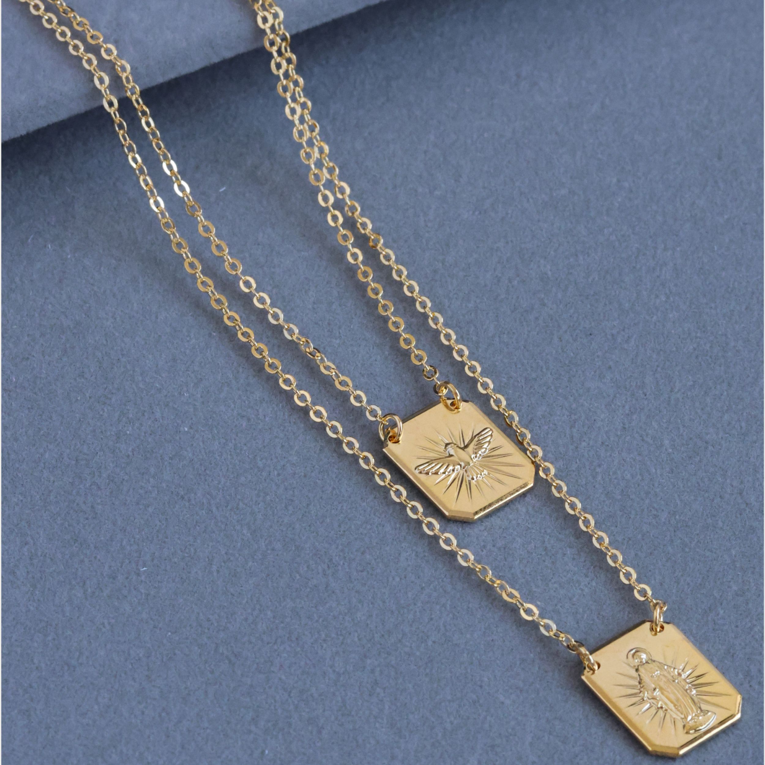 O escapulário Luz, Fé e Paz une espiritualidade, elegância e significado em um design contemporâneo e sofisticado. Com medalhas geométricas douradas, traz de um lado a imagem do Espirito Santo e, do outro, Nossa Senhora das Graças, ambos em relevo delicado, emoldurados por um acabamento polido que reflete a luz com suavidade.