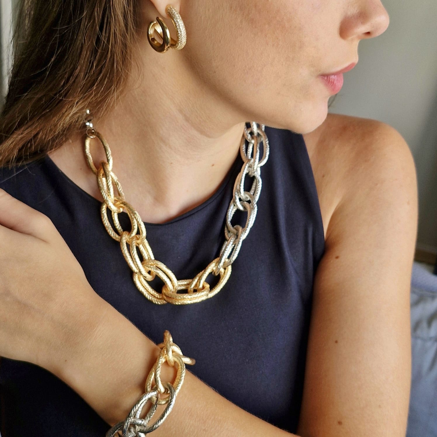 Imponente e sofisticado, o Maxi Colar Dual é a peça perfeita para mulheres que amam acessórios marcantes e cheios de personalidade. Seus elos robustos, em tons dourado e prateado, criam um contraste elegante e versátil, ideal para complementar qualquer look com um toque de modernidade e luxo. A textura ranhurada adiciona profundidade e brilho refinado, destacando ainda mais o design exclusivo.
