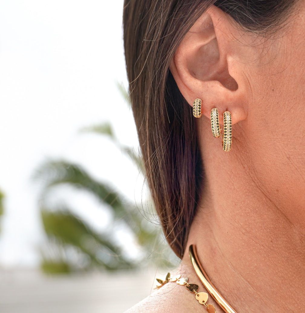 Trio de brincos argola com cravação em zircônias na cor cristal e preta.